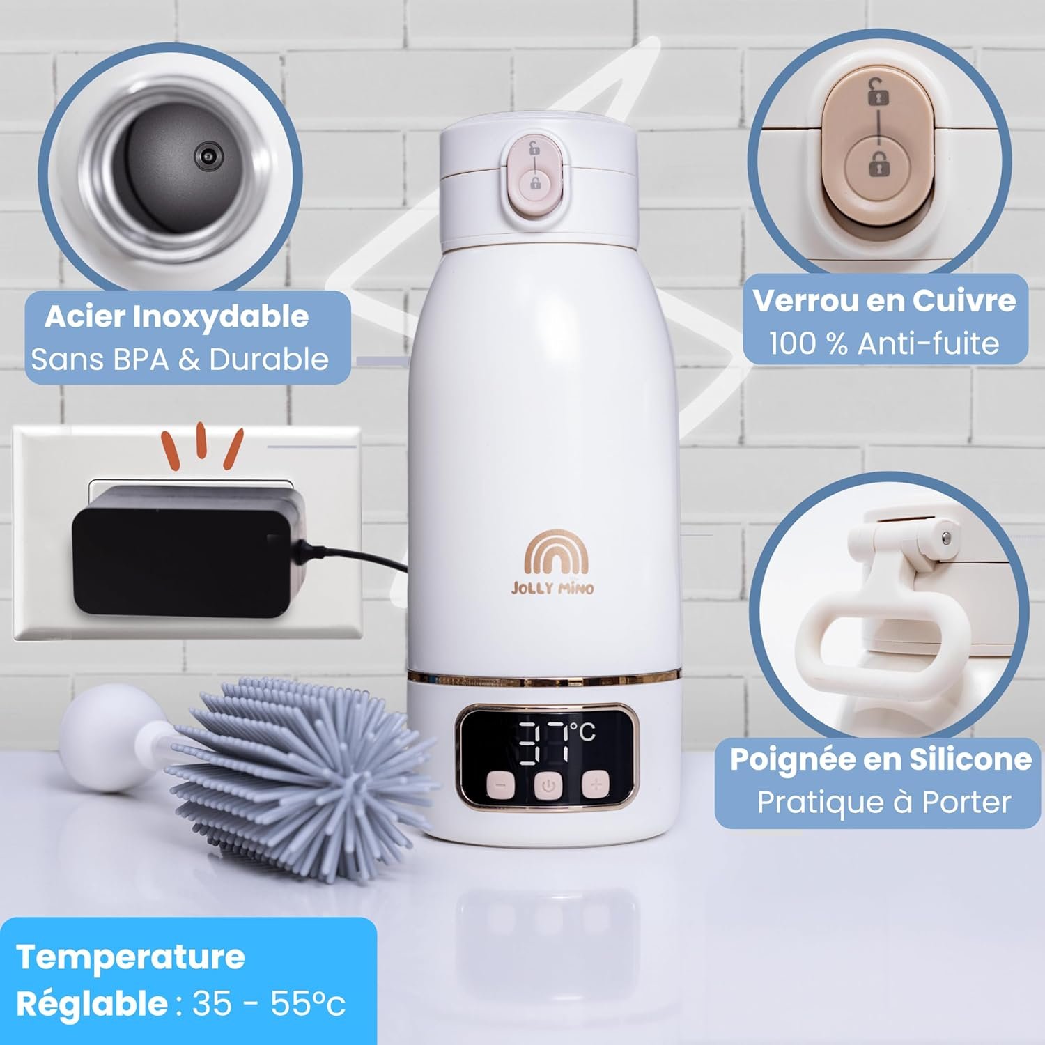 Chauffe Biberon Nomade Sans Fil 500 ml – Chauffe Eau et Lait Portable – Inox Sans BPA – Recharge Rapide – Brosse Incluse – Idéal Nuit et Déplacements – Nettoyage Express 65°C