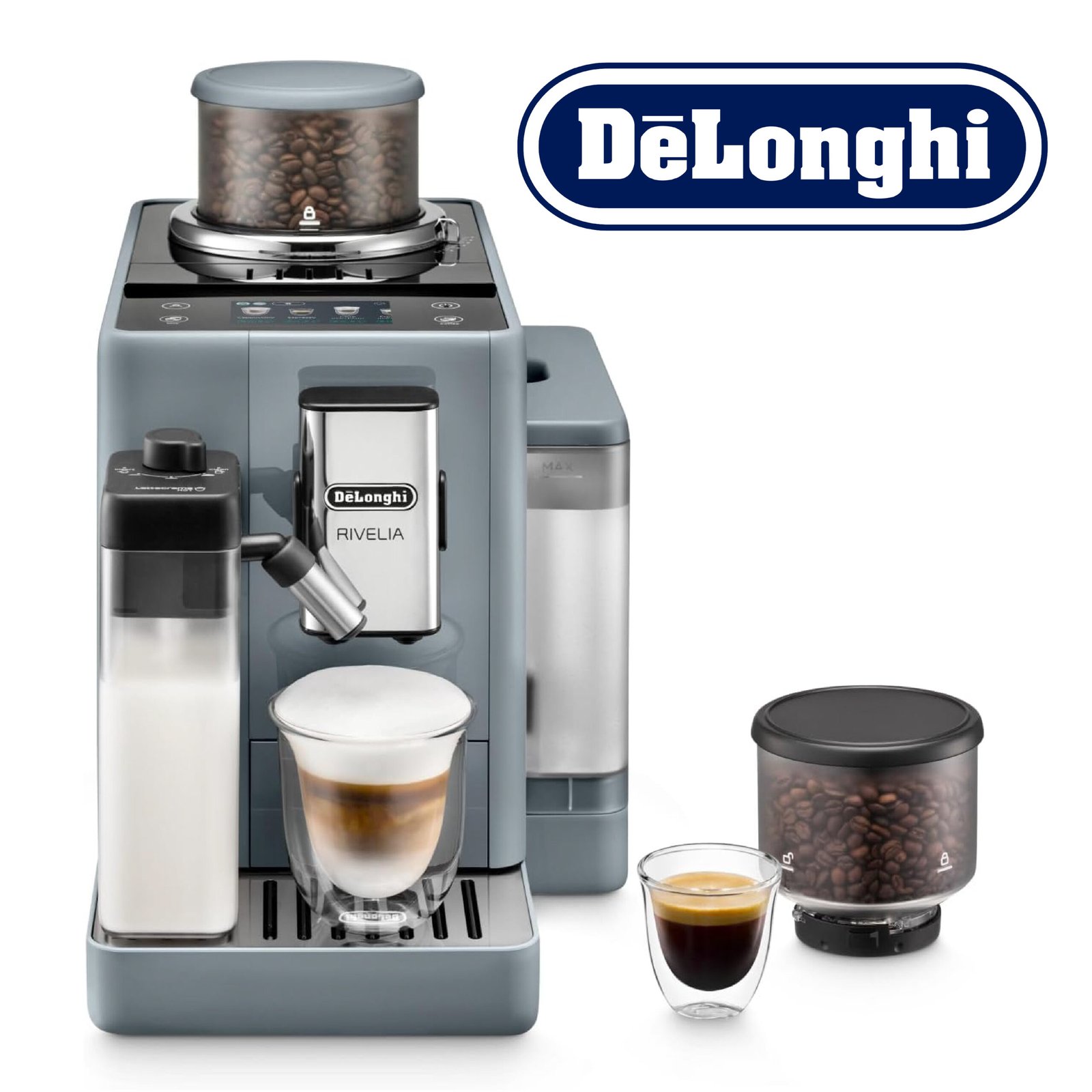 De’Longhi Rivelia EXAM440.55.G, Machine à Café Automatique avec LatteCrema Hot, Mousseur de Lait Automatique, Taille Compacte, 16 Recettes, Écran Tactile