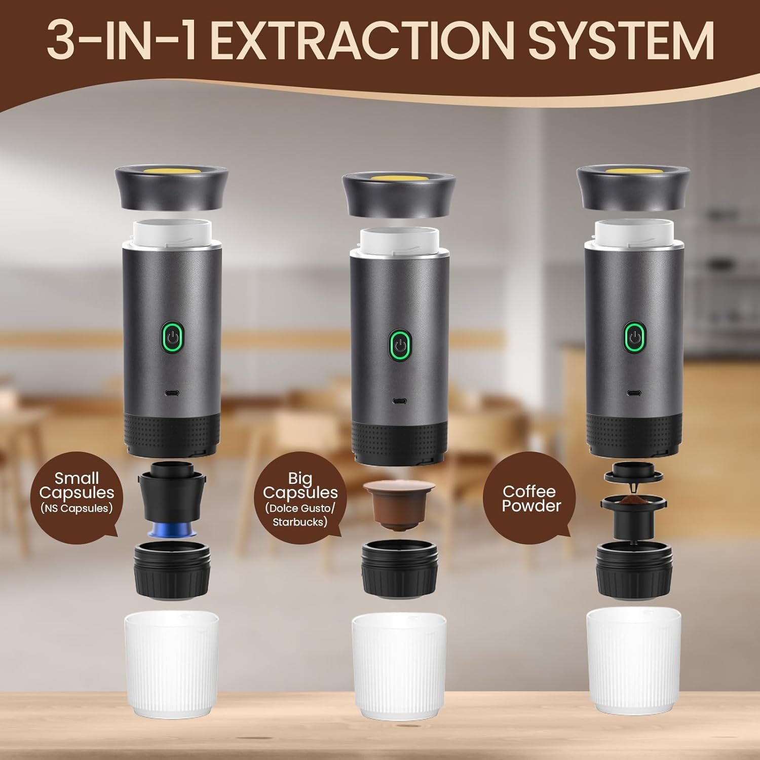 Machine Espresso Électrique Portable 3-en-1 café moulu, capsules Nespresso et Dolce Gusto chauffe 60 ml d’eau jusqu’à 90°C en 5 minutes