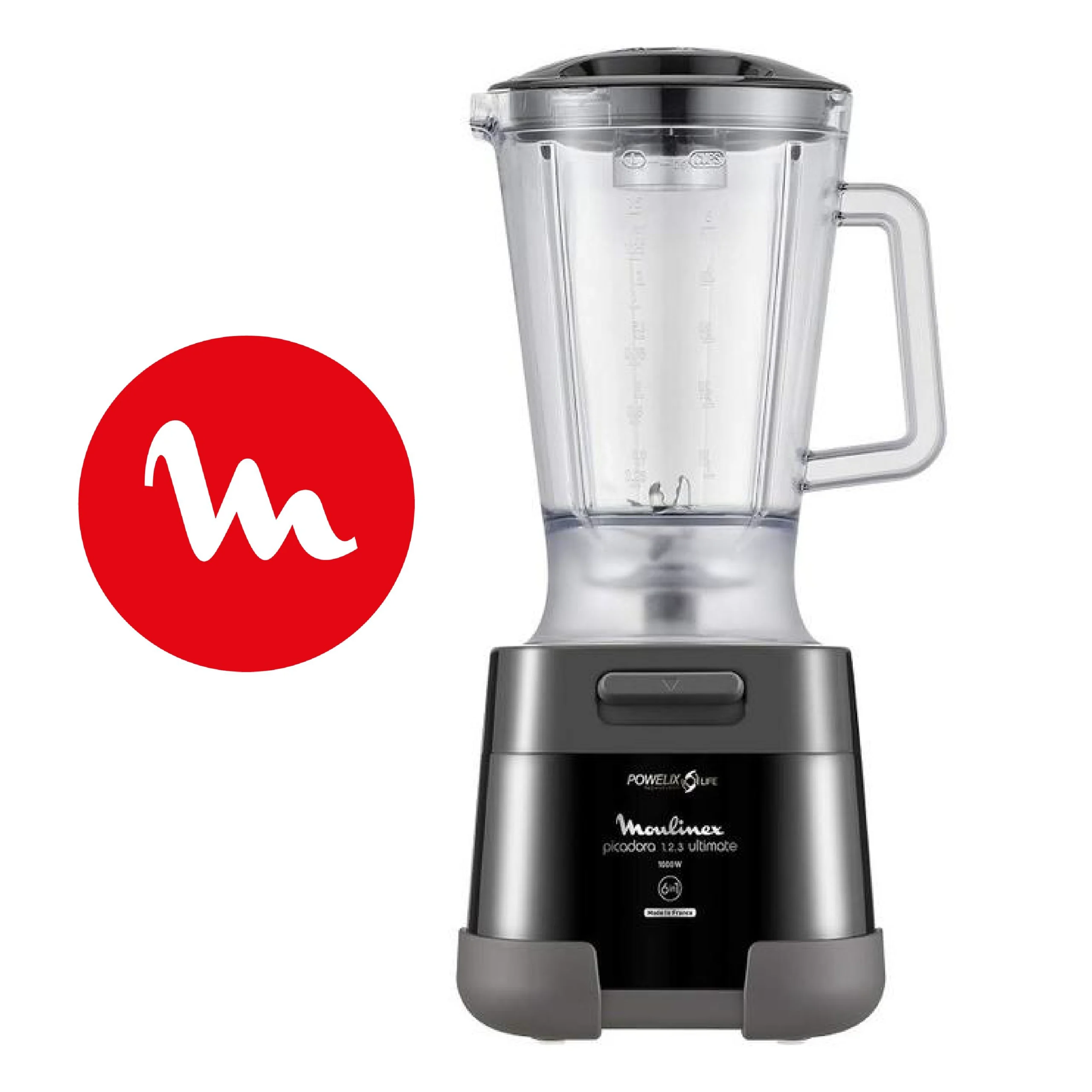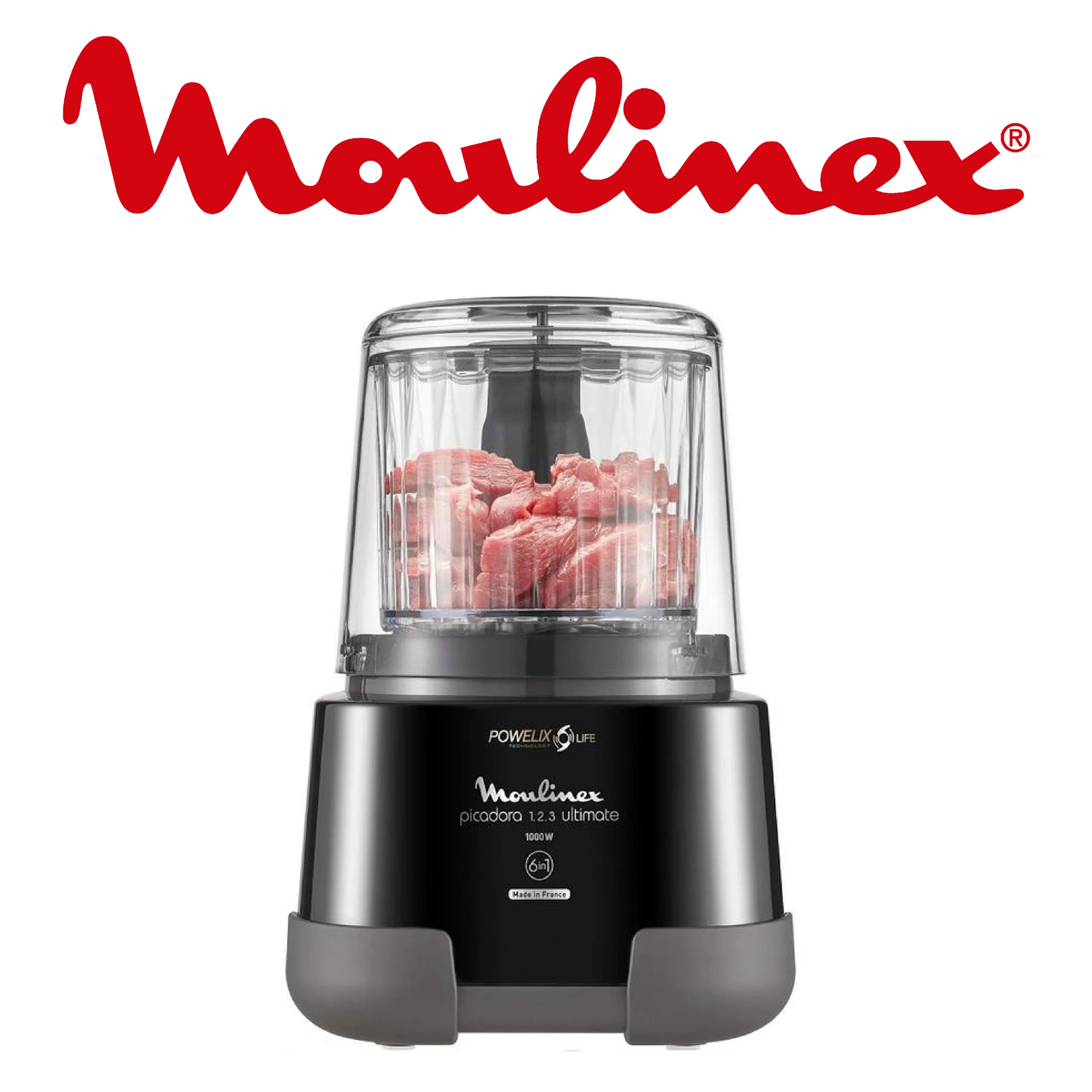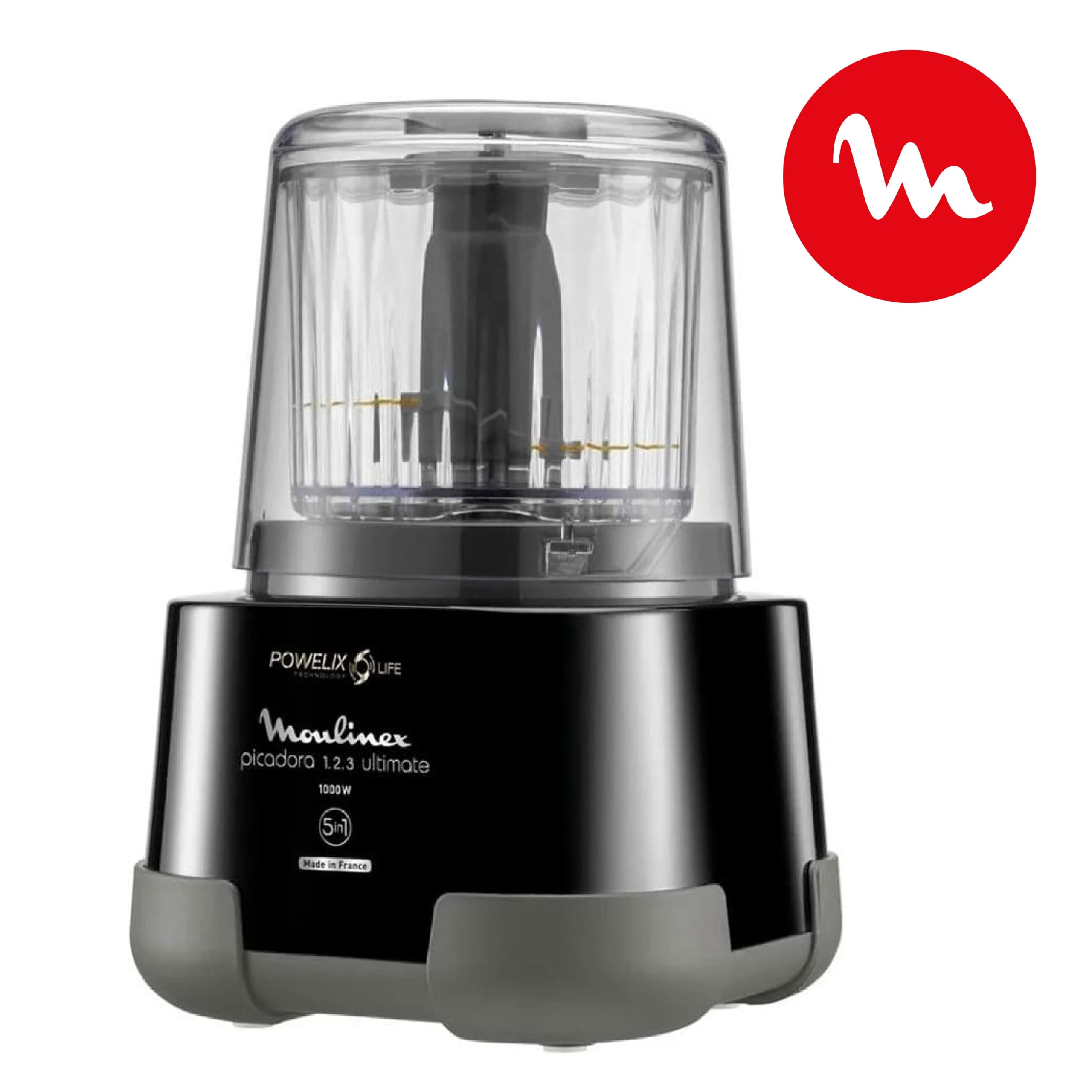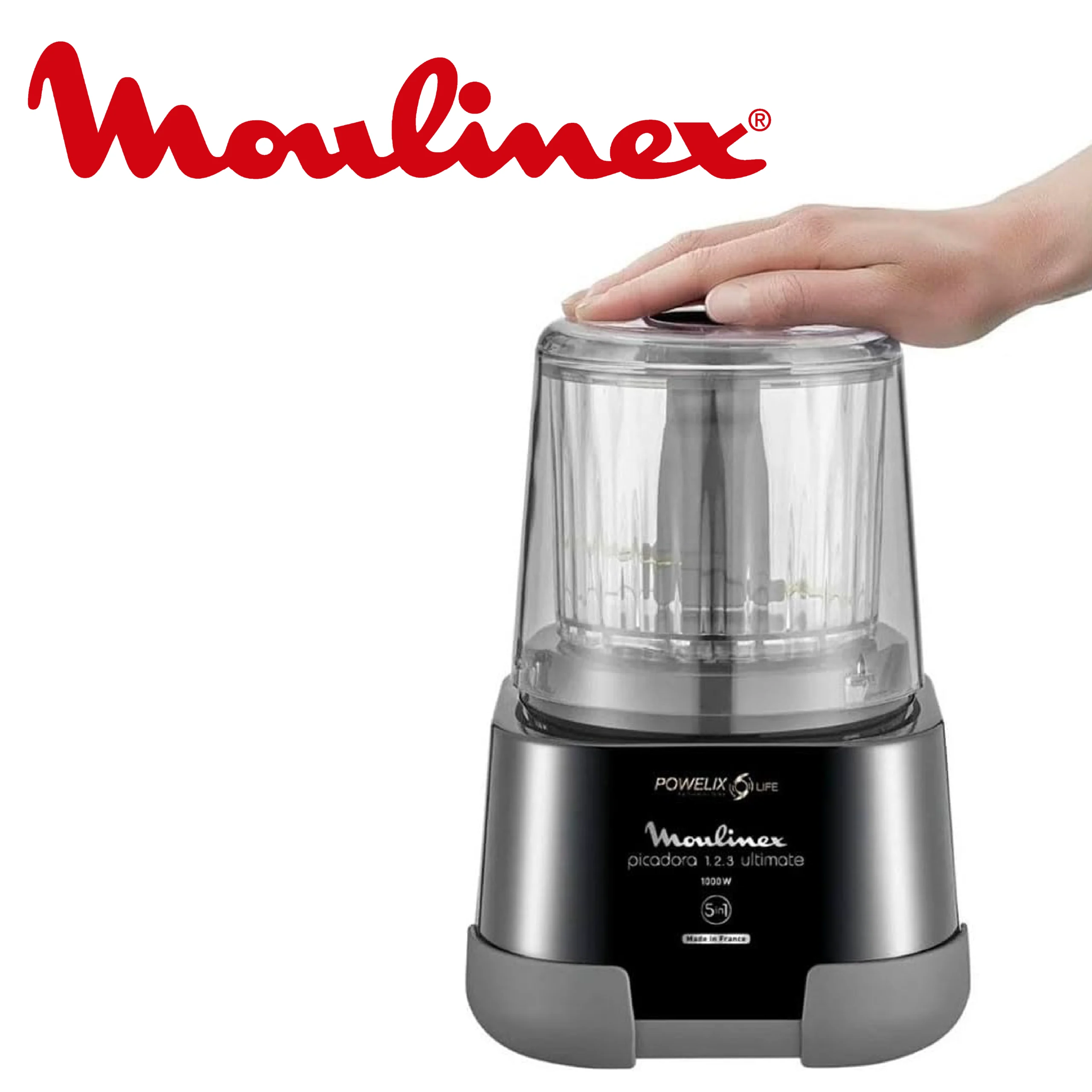 Moulinex 1.2.3 Ultimate DP8158 Hachoir électrique et mixeur avec bol en verre 1000 W Powelix, capacité 350 g/550 ml, revêtement titane noir