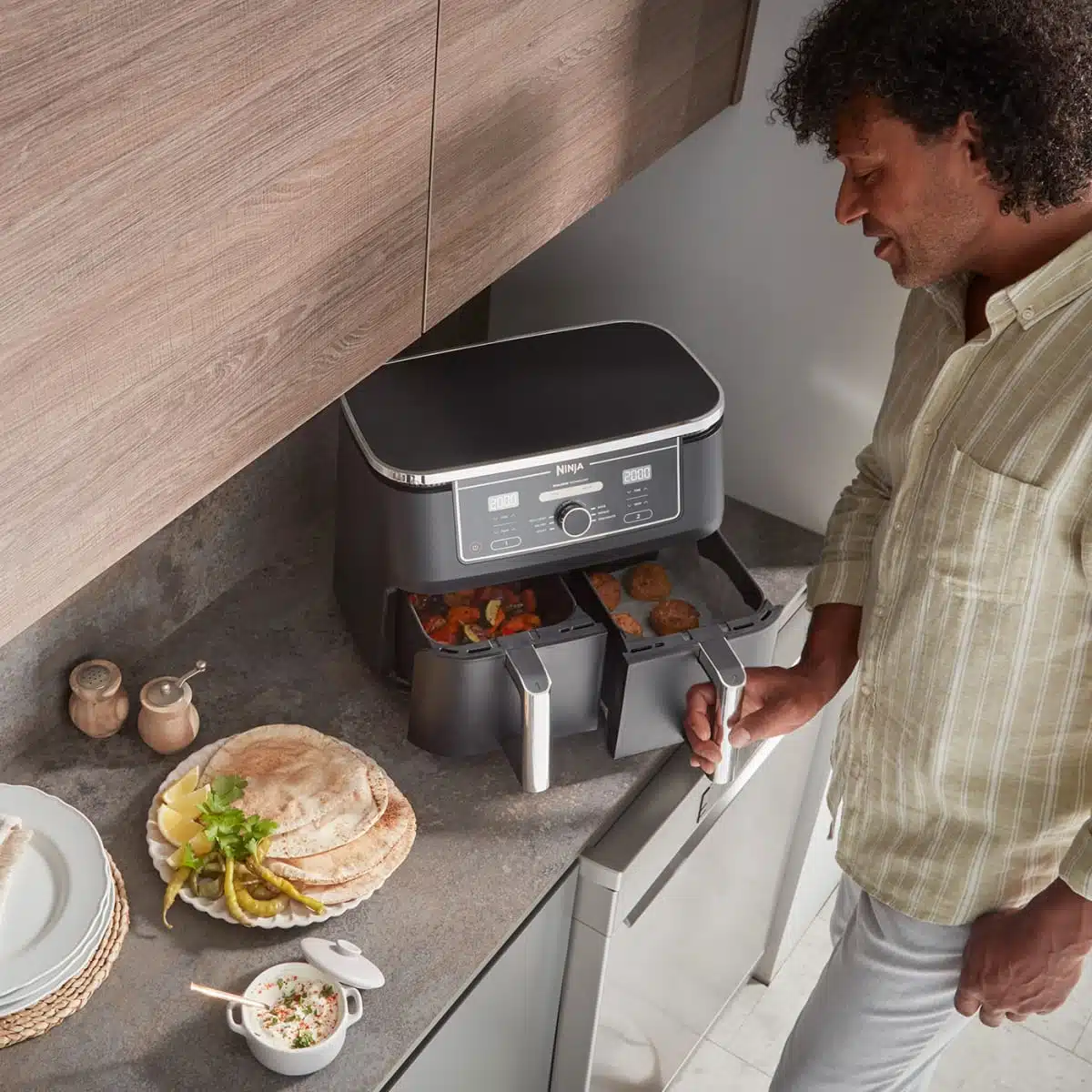 NINJA Foodi MAX Dual Zone Air Fryer, 2 Tiroirs, 9,5L, 6-en-1, Sans Huile, Air Fry, Croustillant Max, Rôtir, Cuire, Déshydrater, 8 Portions, Paniers Antiadhésifs Vont Au Lave-Vaisselle, Noir AF400EU