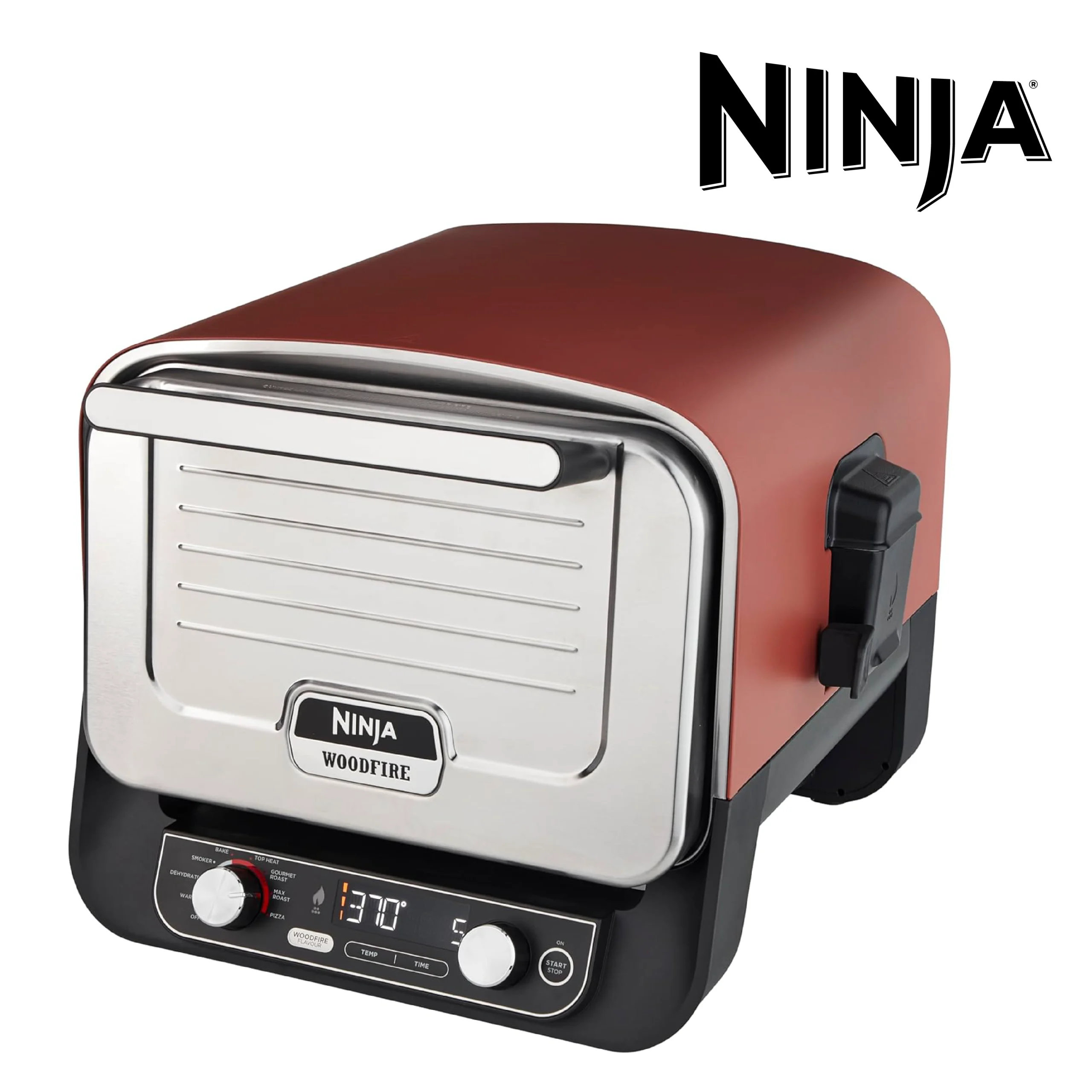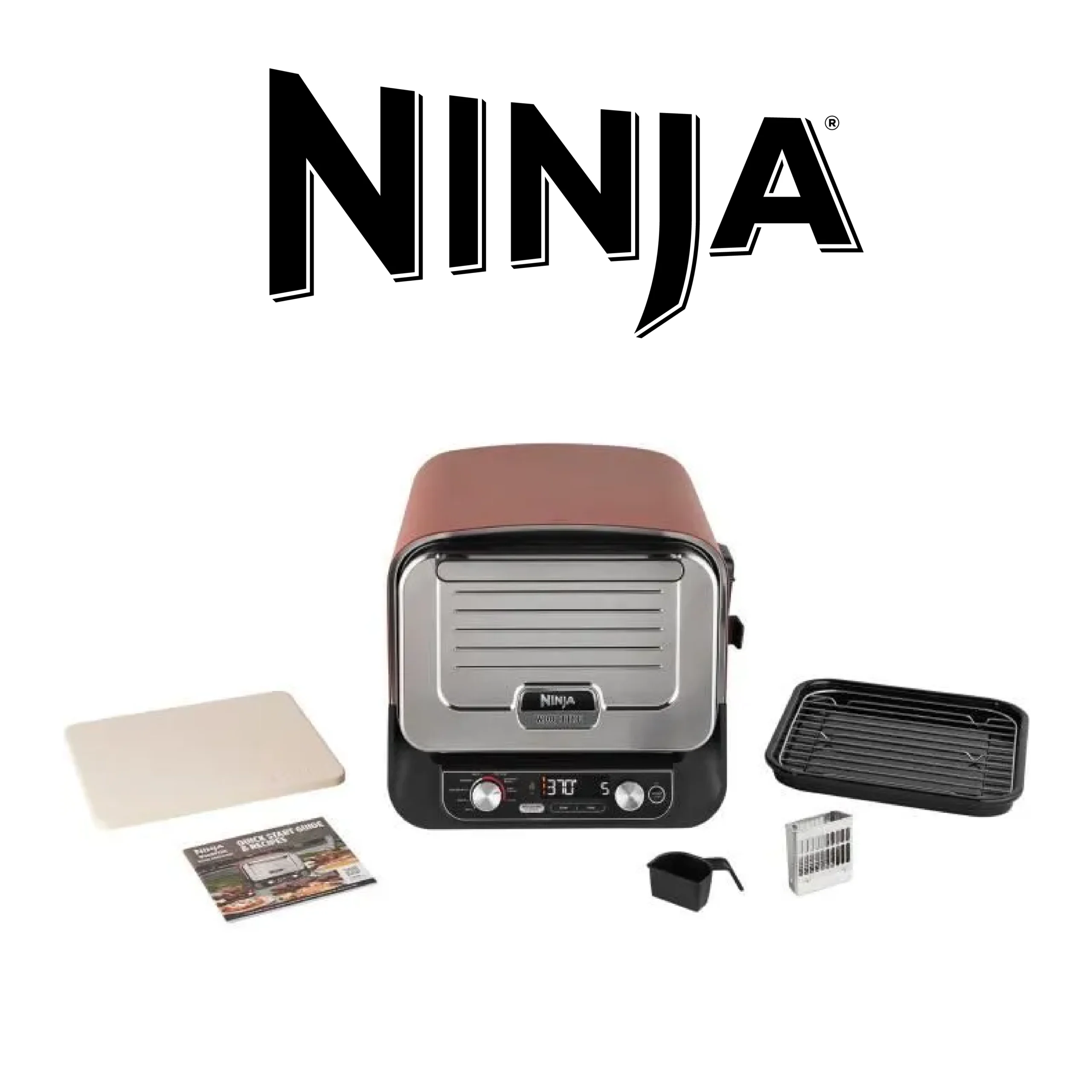 Ninja Woodfire Four à pizza extérieur électrique 8-en-1, rotissoire & fumoir barbecue avec grille, plaque pro-heat, pierre à pizza, granulés de bois et pelle, 6 réglages, orange foncé OO101EU