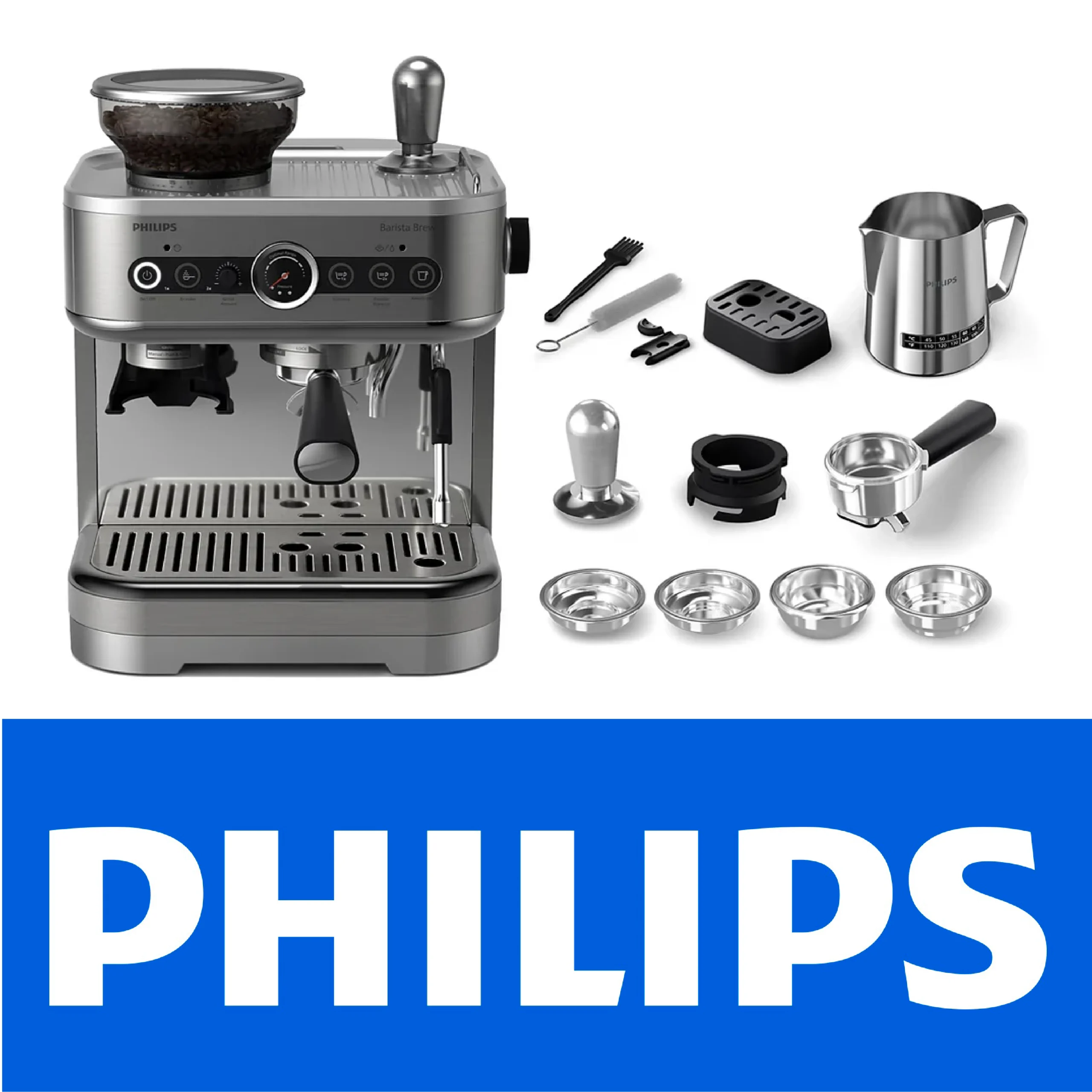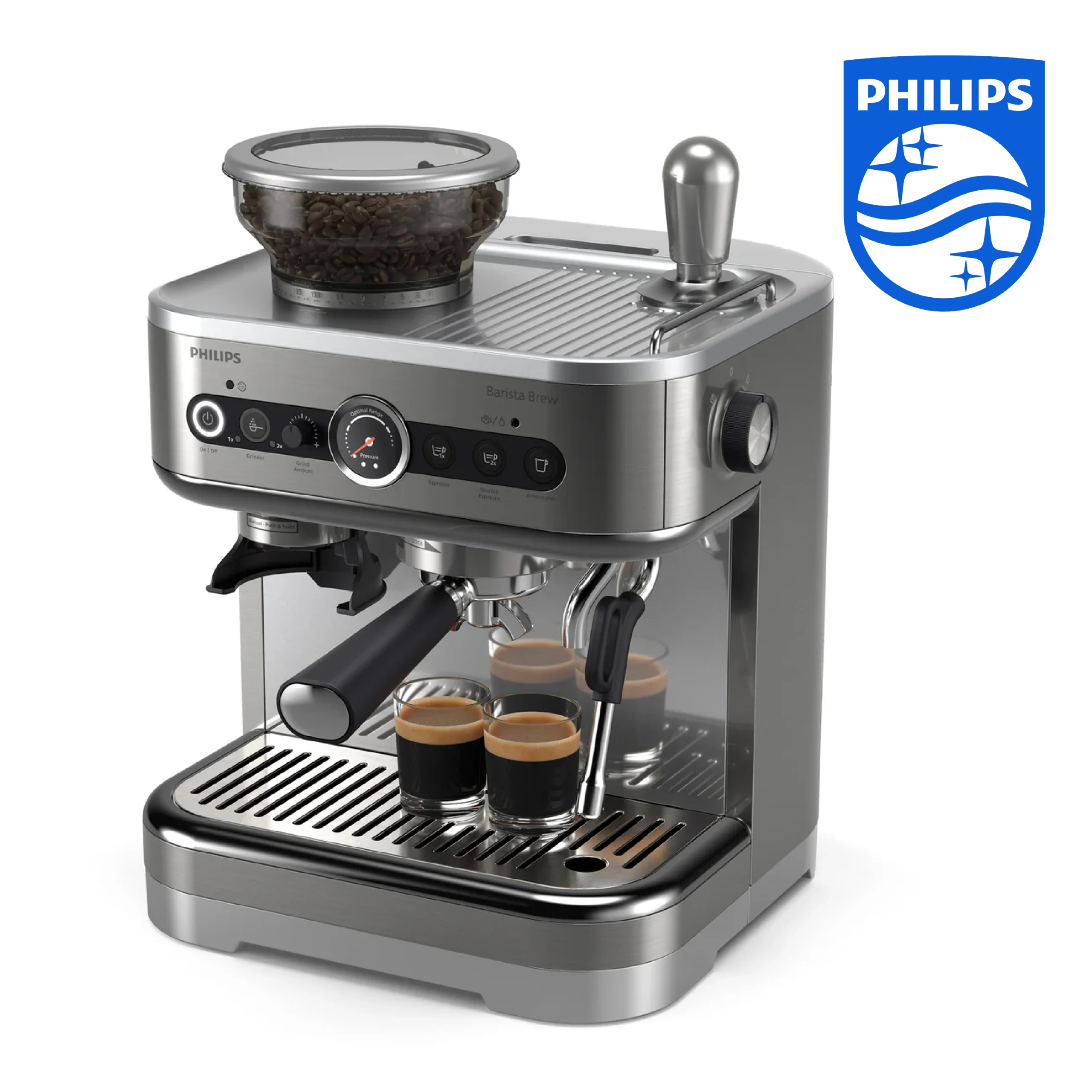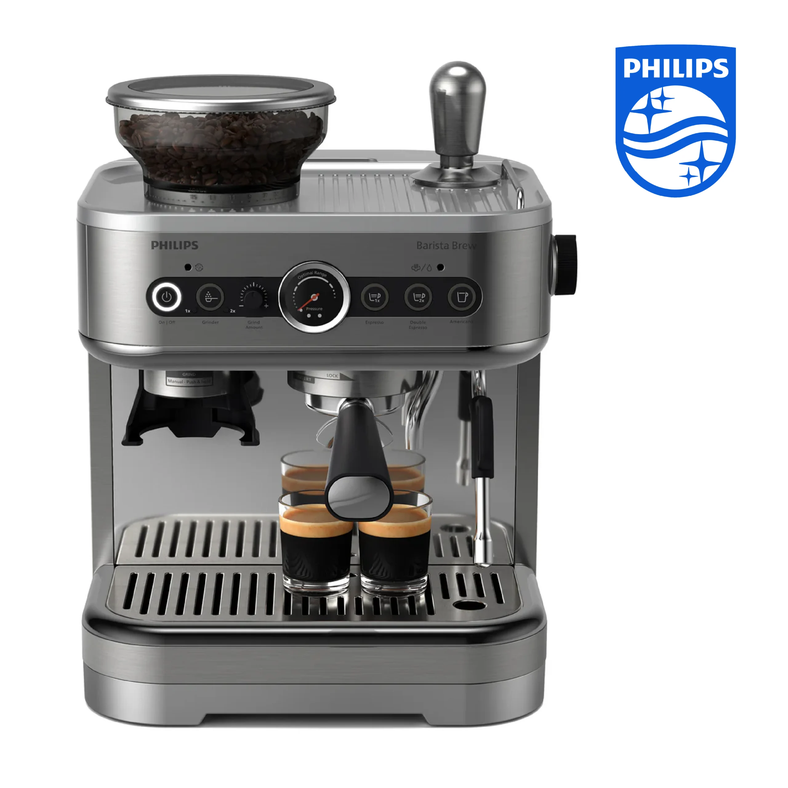 Philips Barista Brew Machine à espresso semi-automatique – bouton Espresso simple et double + Americano, réservoir à grains double de 280g, bourrage calibré, Cappuccino en métal (PSA3228/41)