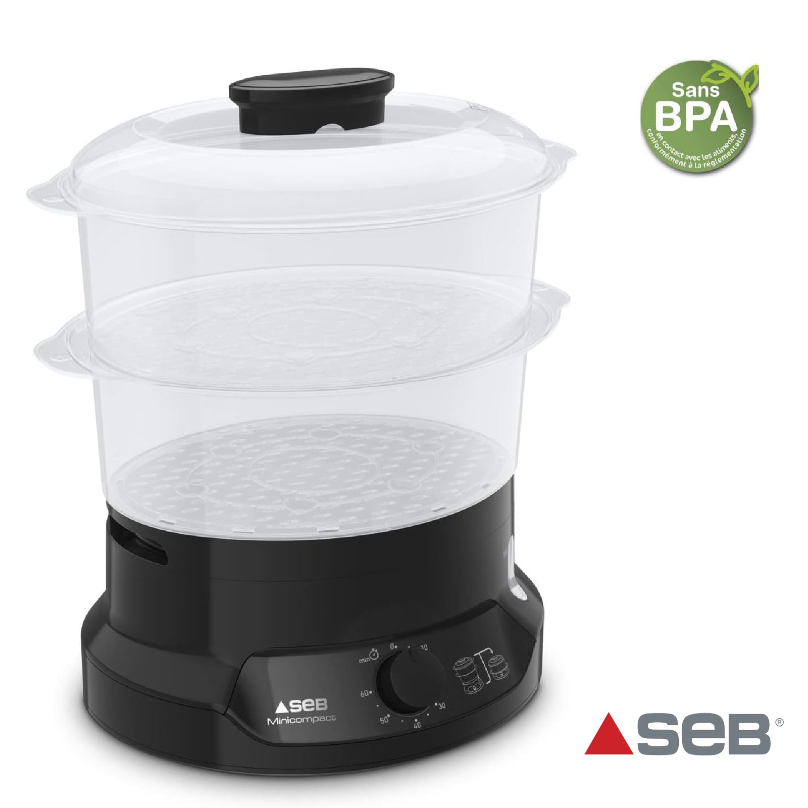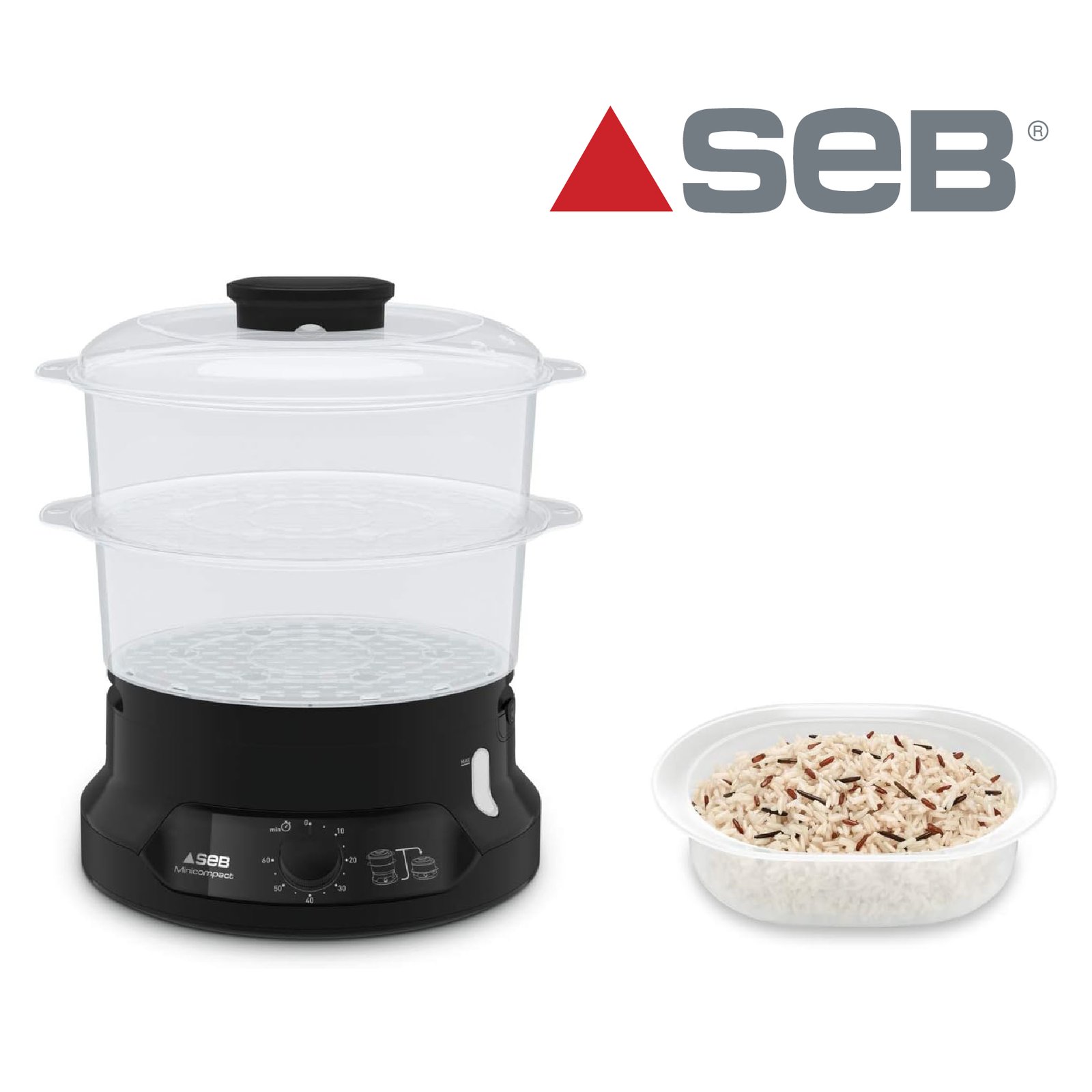 Seb Minicompact Cuiseur vapeur, Cuisson saine, 6 L, 800 W, 2 bols empilables, Bac à riz et céréales, Minuteur 60 min, Arrêt automatique, Niveau d’eau visible, Facile à ranger VC139800