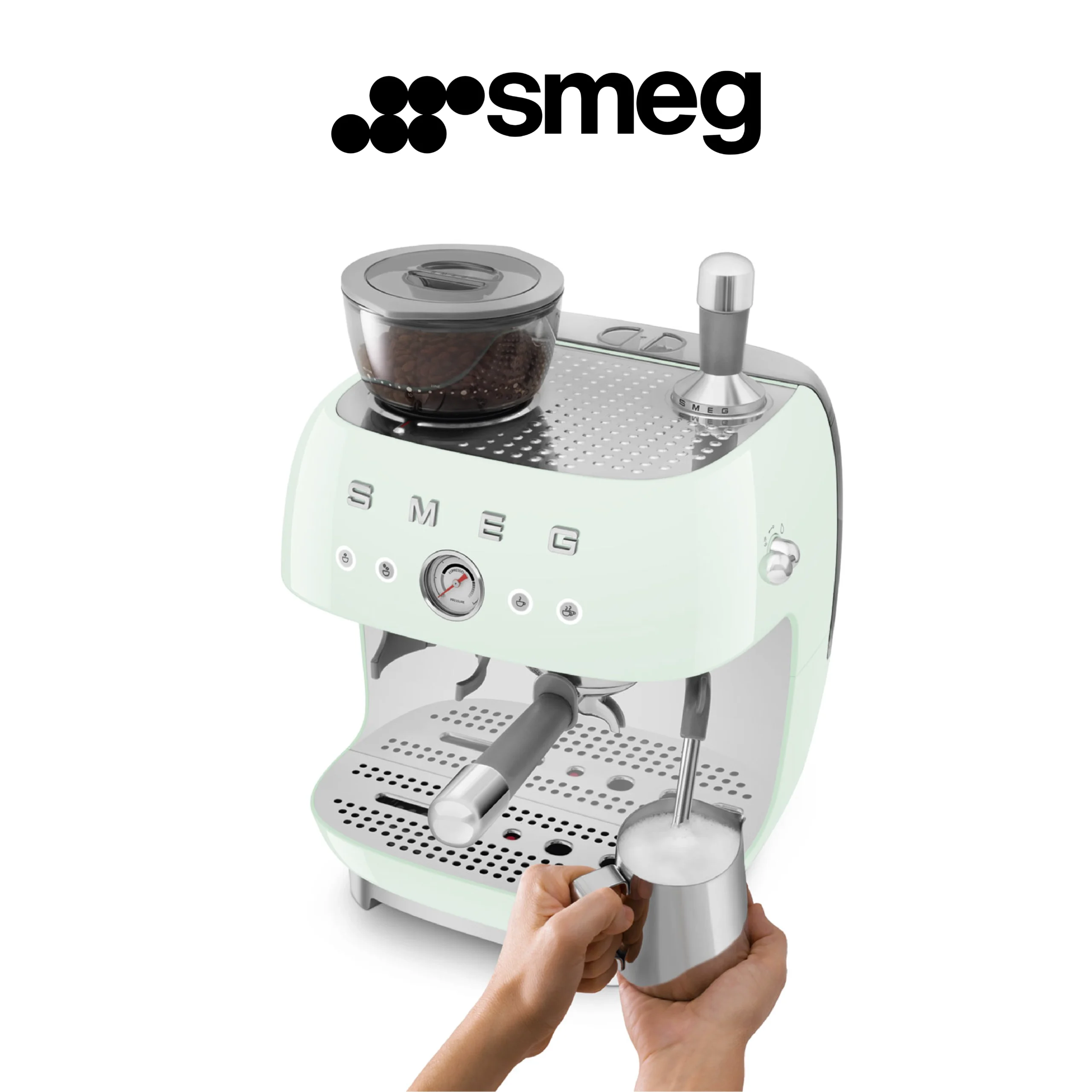 Smeg, Machine à Café Expresso Manuelle EGF03PGEU, avec Broyeur à Grain Intégré, Thermoblock, 4 Niveaux de Température, Buse Vapeur et Manomètre, Réservoir 1 L, Dimensions Compactes, 1350W, Vert d’eau